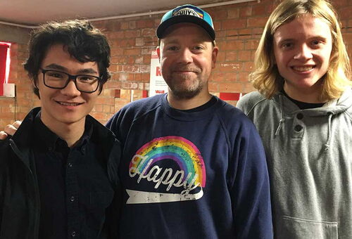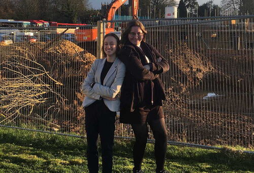 We found a break in the rain to take a picture of two Y12 PAC volunteers, Emma and Ella, next to the site for the Performing
