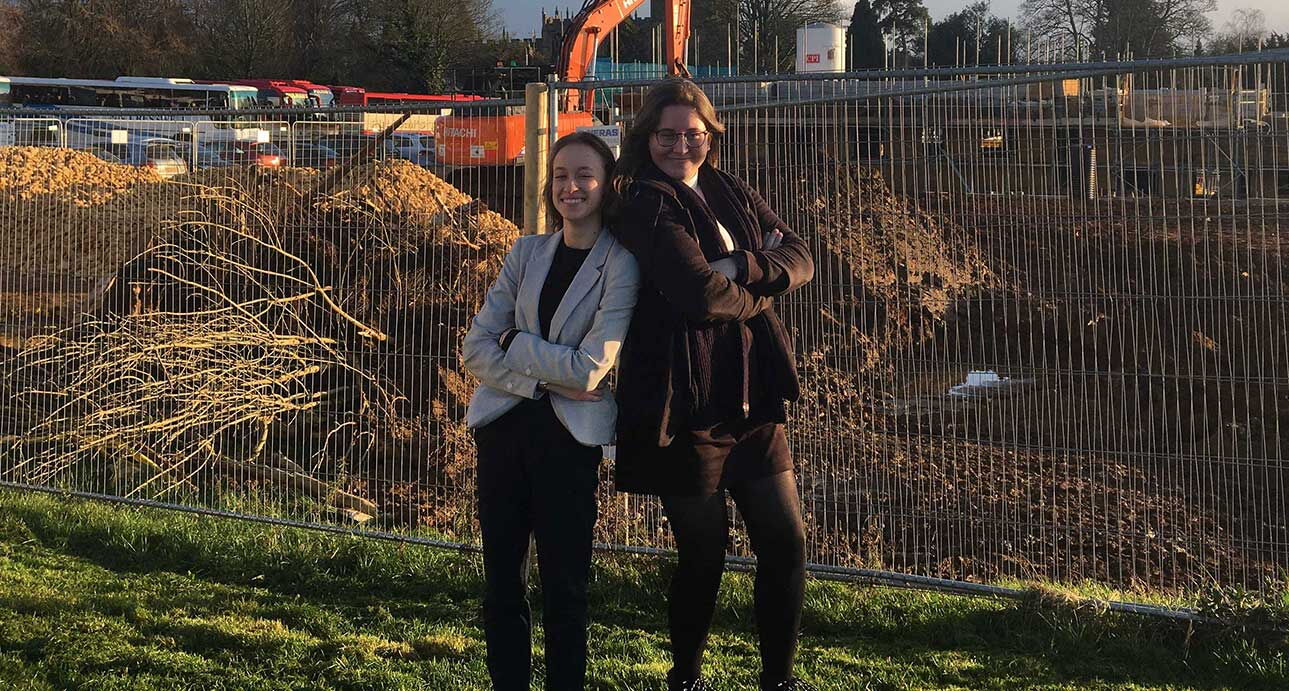 We found a break in the rain to take a picture of two Y12 PAC volunteers, Emma and Ella, next to the site for the Performing Arts Centre. Watch this space to see how the plot blossoms into the Performing Arts Centre and follow our progress on Instagram, Twitter and Facebook.